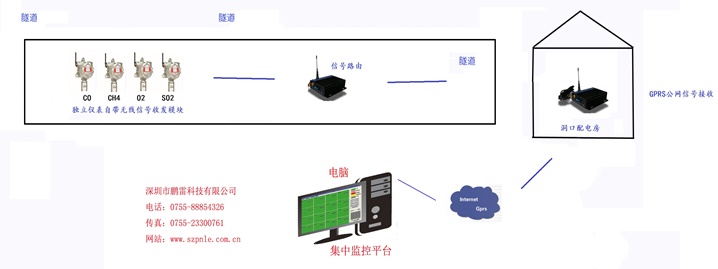 仪表本身配置的无线信号模块,采用的数据无线传输距离可达3-4公里,但是随着隧道的工况和弯道不同,可能需要配置信号中继器。视具体隧道的长度,来配置1-2个信号中继器,信号中继器也采用畜电池供电。